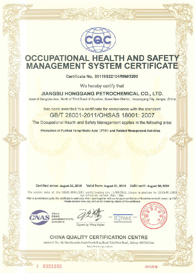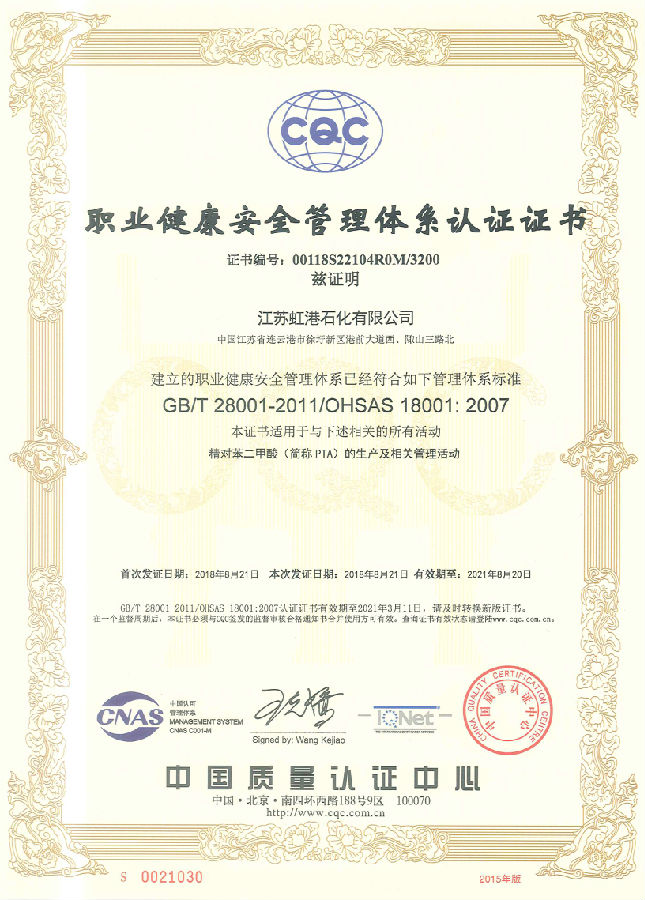 8月22日,虹港石化順利通過(guò)職業(yè)健康安全管理體系認證,并獲得中國質(zhì)量認證中心頒發(fā)的認證證書(shū)。